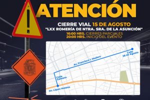 Con motivo de la LXX Romería de la Asunción que se llevará a cabo este viernes 15 de agosto, la Secretaría de Seguridad Pública Municipal de Aguascalientes informa que a partir de las 16:00 horas iniciarán cierres parciales, posteriormente a las 18:00 horas se implementará el cierre total y a las 20:00 horas dará inicio la peregrinación.